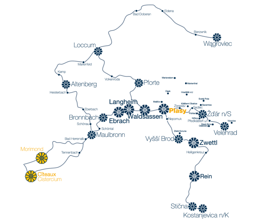 Evropská síť Cisterscapes s vyznačením dochovaných stop po cisterciácích (i Plasy)