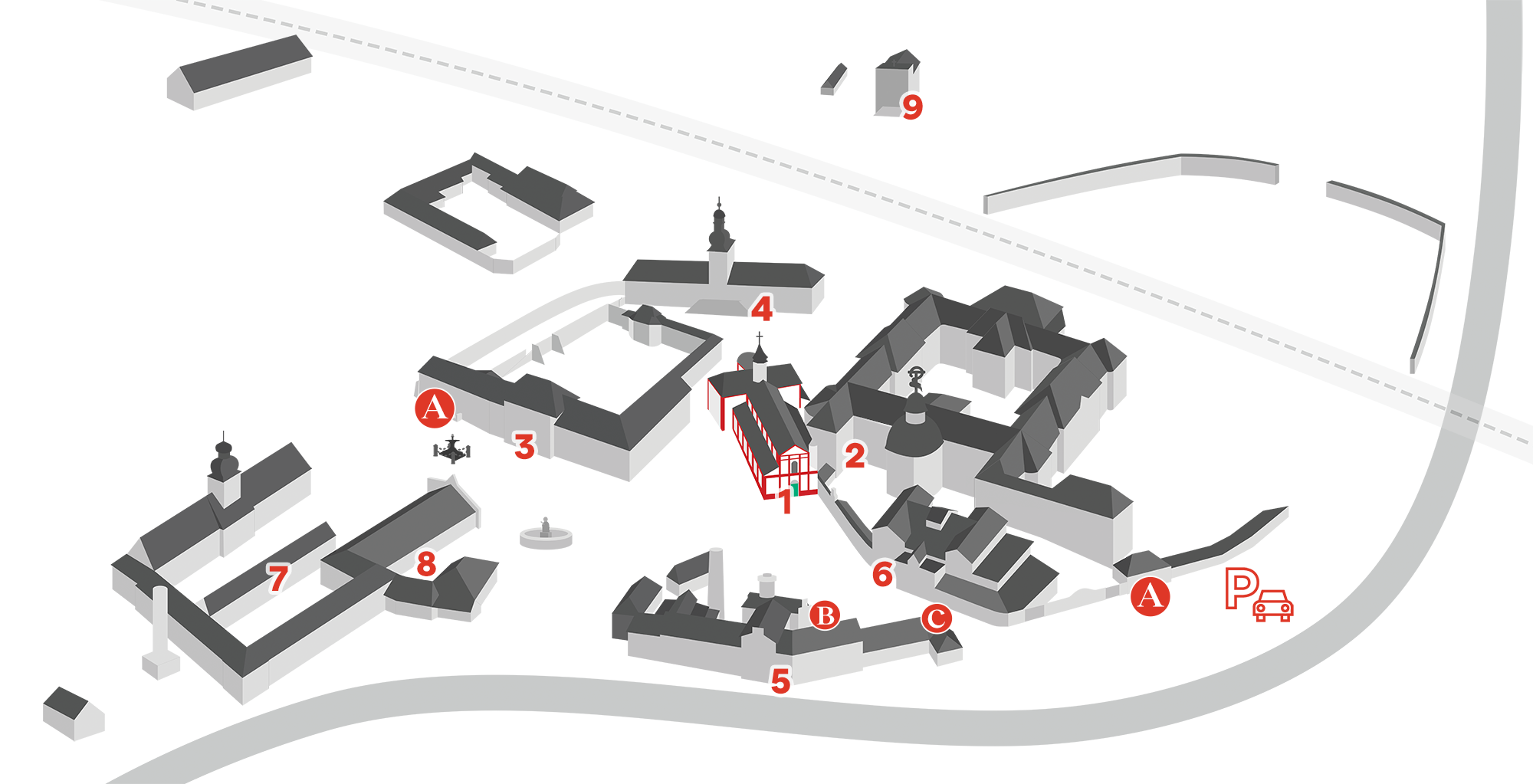 A • POKLADNA - PROHLÍDKY KOSTELA ①, KONVENTU ②, ZÁMKU ③, SÝPEK ④