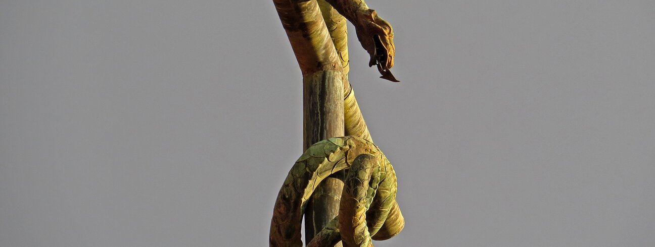 Písmeno E zde bylo zpodobněno ve formě hada, což přináší další vrstvu symboliky. Jeho význam je třeba hledat v biblických příbězích, zejména v Mojžíšově měděném hadovi. Podle Starého zákona byli Izraelité během putování pouští trestáni za reptání proti Bohu jedovatými hady. Mojžíš se za svůj lid přimluvil, a Hospodin mu přikázal vztyčit na holi měděného hada – každý, kdo na něj pohlédl, byl zázračně uzdraven.