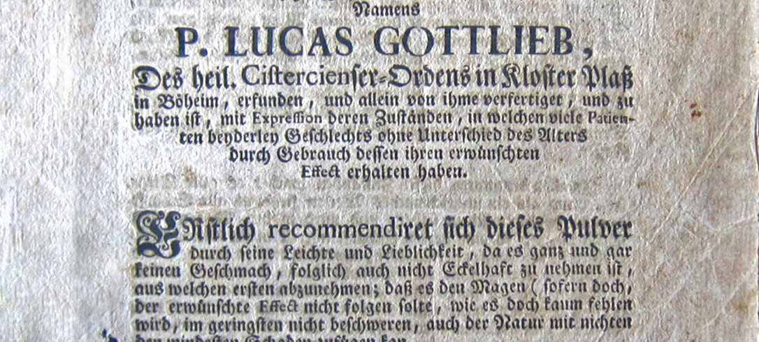 Zachovalo se málo popisů tohoto léku - topograf Jaroslav Schaller jej charakterizuje jako tak slavný, že nepotřebuje rozsáhlé představení. Přesto: Vynálezcem prášku byl páter Lucas Martin Gottlieb, podle klášterních záznamů narozený roku 1716 v Einsiedlu nedaleko Chebu. Ve 24 letech se stal laickým bratrem, teprve mnohem později přijal řeholní sliby. Celý život zasvětil lékárenství, chemii a lékařství.